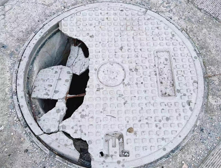 调查中发现,掇刀区团林铺镇育才路、至信大道、团何路口、将军路等中小学生上学必经道路上,多处窨井盖存在不同程度的破损、塌陷、凸起、缺失等问题。此类问题井盖周围未设置相应的安全提醒警示标志和安全防护措施,缺失井盖亦未进行补缺或采取临时覆盖措施,对行人和行车安全造成较大隐患,调查小组当即拍照取证并一一记录。