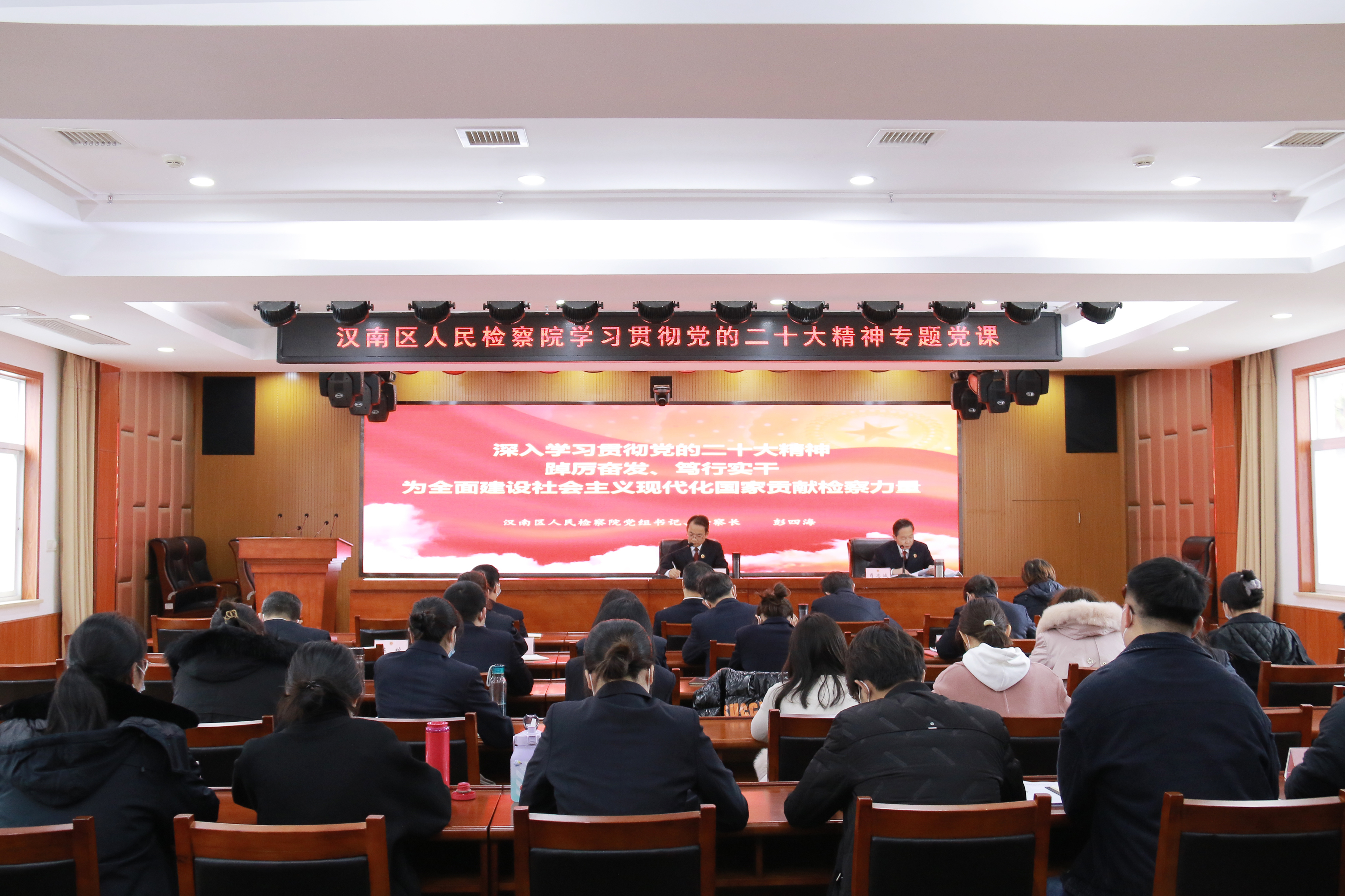 本网讯(通讯员:薛婉云)为深入学习宣传贯彻党的二十大精神,把全院干警的思想和行动统一到党的二十大各项决策部署上来128日,汉南区检察院党组书记、检察长彭四海以《踔厉奋发、笃行实干 为全面建设社会主义现代化国家贡献检察力量》为题给全院干警上了一堂主题鲜明、内涵丰富的专题党课。